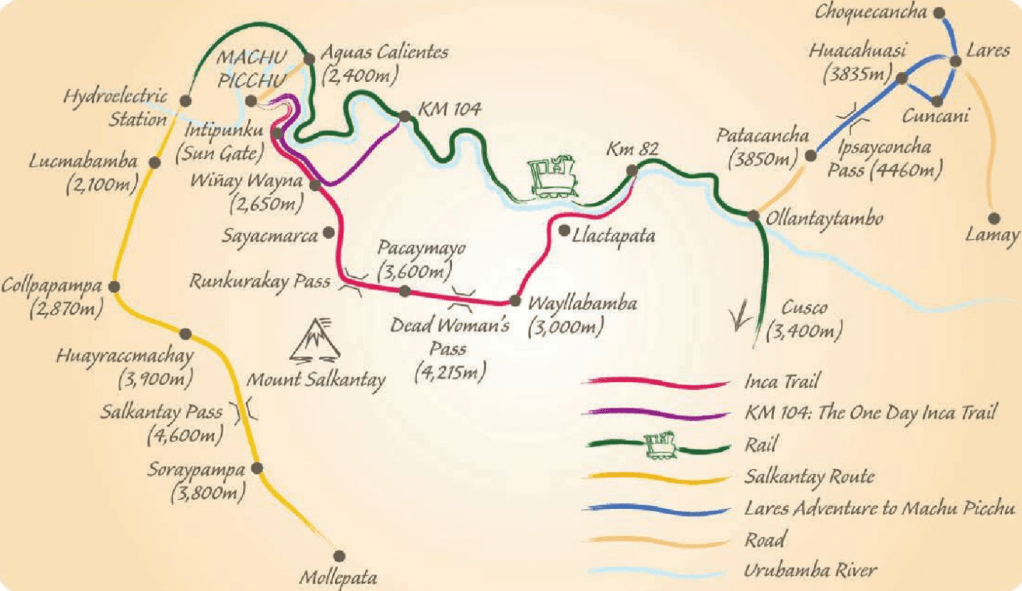 So let’s jump into the different ways to get to Machu Picchu. The town you need to be able to get to is called Ollantaytambo. The start of the Inca Trail is about 20 minutes drive away from here as well as the Lares Trail and the Salkantay Trail. The train to Machu Picchu goes directly from the town if this is your preferred method of travel. Below is a photo to best explain the different routes you can take to the beautiful city.